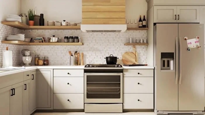 Another trend we love seeing is the Integrated Hoods. This look is all about the seamless blend of materials wrapped on the hood. You can take a simple white subway tile and wrap it all the way up the wall and on the hood. Or you can take wood planks and create a warm vibe all your own. You can even take your countertop material of choice and integrate that into the hood as well. All of this is to create less distraction and less contrasting of materials. The focus of this new design trend is that by creating less contrasting materials, you create a seamless, calmer and more integrated space for which to enjoy your kitchen.
